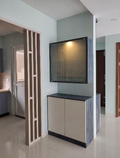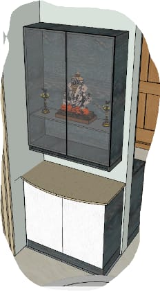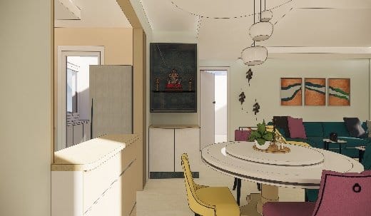 The pleasant addition of the puja unit in the dining area behind the entry wall as per the vastu a storage unit beneath it occupies the pride of the space.