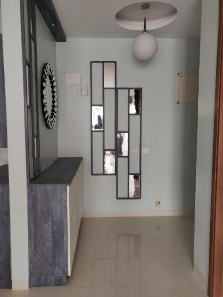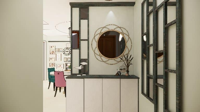 The Foyer space is beautiful mixture of textures and styles, white laminated wooden shoe rack along with a decorative mirror and wall panelling followed rustic pattern laminates with mirror and costal décor elements on both the side of the wall makes this space edgy.