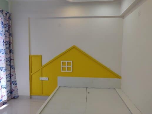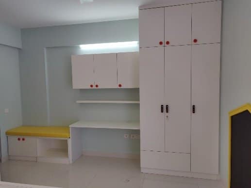 Our client wanted this room for their 1-year-old kid, this theme based room with bold colours popping out executed by our team thoughtfully affixing study and toy storage with seating alongside elegant white finish kids wardrobe and a custom made cot with a hut kind of panelling painted in yellow to give striking touch.
