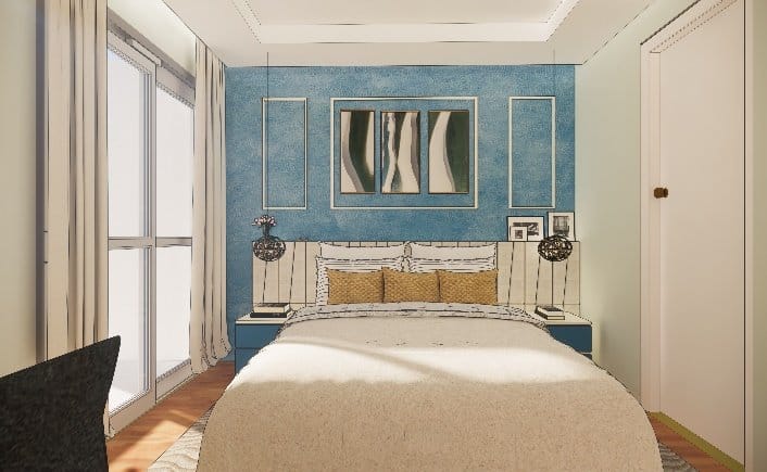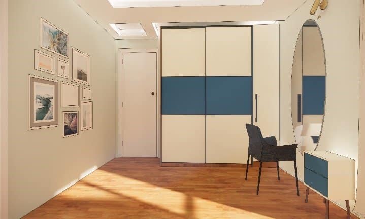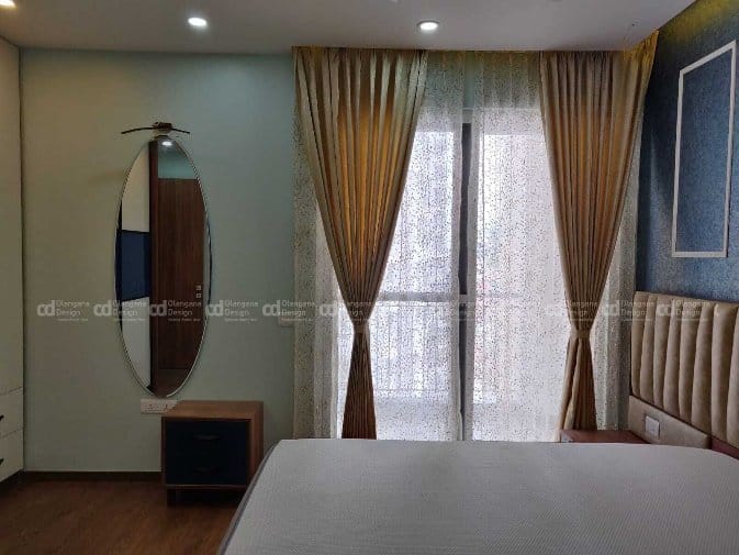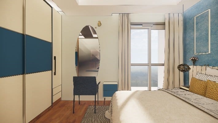 We executed this master bedroom with ceiling height exquisite wardrobe in hues of royal blue and milky white finish, a storage unit next to the sliding door and beautiful dresser with oval mirror concept, the customised pastel curtains were designed to drop from ceiling to go with the headboards of custom-made cot highlighting the back wall with lovely blue wallpaper and European style beadings, finishing the design with simple false ceiling.