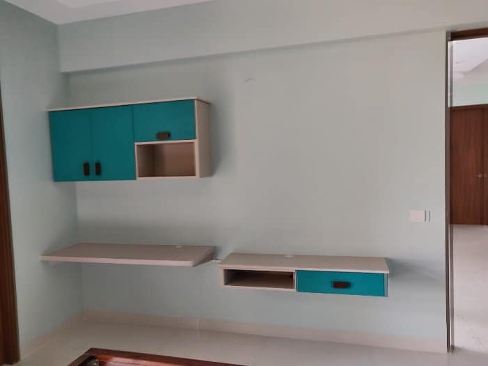 Guest room was designed in a way makes anyone feel at home instantly. Enlisted under best interior designing company in Bangalore follow perspective planning to understand the client needs and create a value for money. To design this room, we choose radiant varying in hues of blue and brown colour pallet wardrobe with wooden handles, working table come tv unit, re used cot with cushion headboard and statement wall papers between two custom made panelling to give chic and dramatic effect.