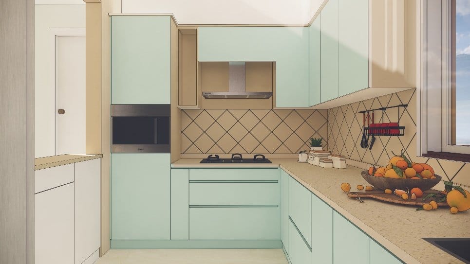 The handelless modular kitchen was curated using matt ocean blue laminates for kitchen cabinets adds serene touch and kitchen slab to facilitate back tiles, integrating small black texture sink on countertop contracting with kitchen slab and micro-oven in the tall unit. Our clients were satisfied seeing how this empty space has been transformed into elegant handelless modular kitchen.