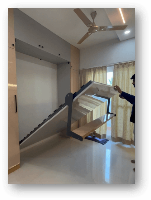 Media Room :The concept of space-saving in the media room was implemented by incorporating a hidden bed and a multifunctional storage unit. A hidden bed was strategically included to optimize space, while a versatile storage unit was designed to serve both as a workspace and for storing items.