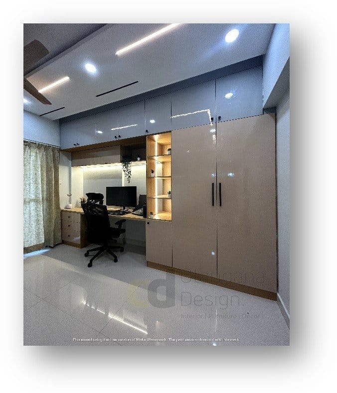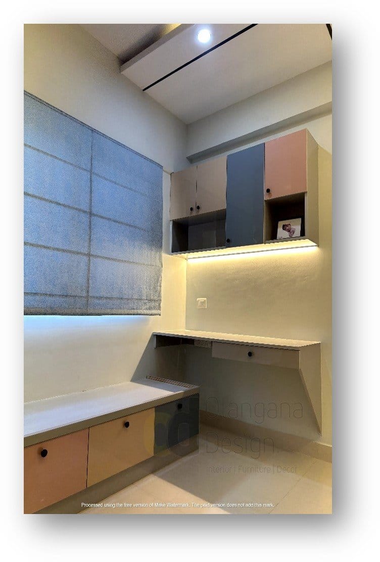 Kids Room: The kids’ room was designed with a soothing pastel colour scheme, featuring a shutter wardrobe for organization and a cosy window seat for relaxation. A functional study table was included to provide a comfortable space for learning and creativity.