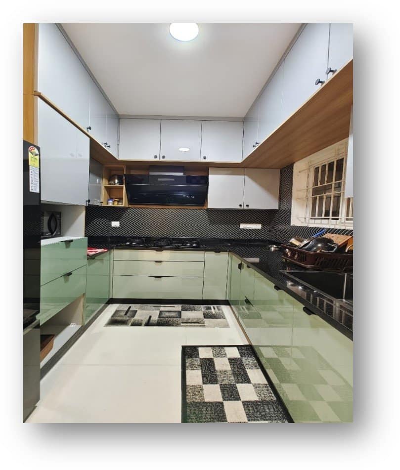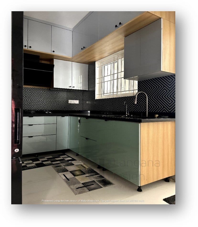 Incorporating pastel green and grey hues, our themed modular kitchen exudes elegance and tranquillity. Galaxy stone accents add a touch of sophistication, while modern-shaped tiles infuse a contemporary flair. Together, these elements create a harmonious space where style meets functionality seamlessly.