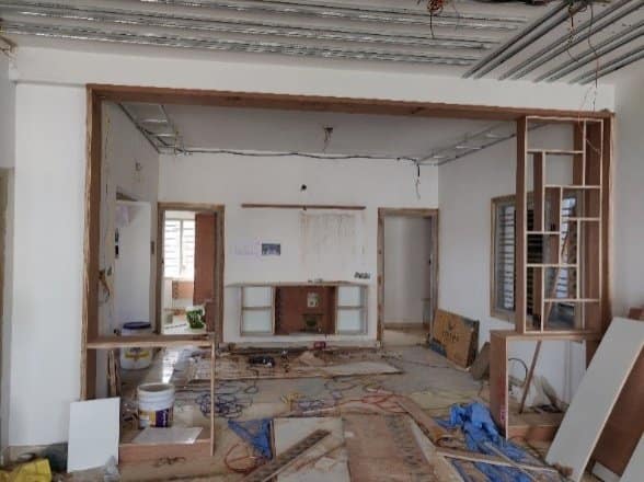 After: Teak brown geometric arch separates dining from living, adding structure and elegance.