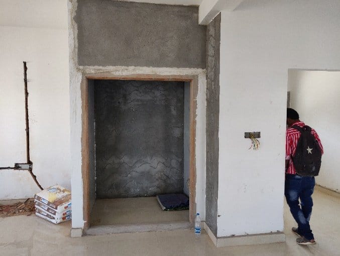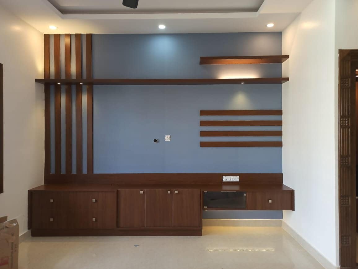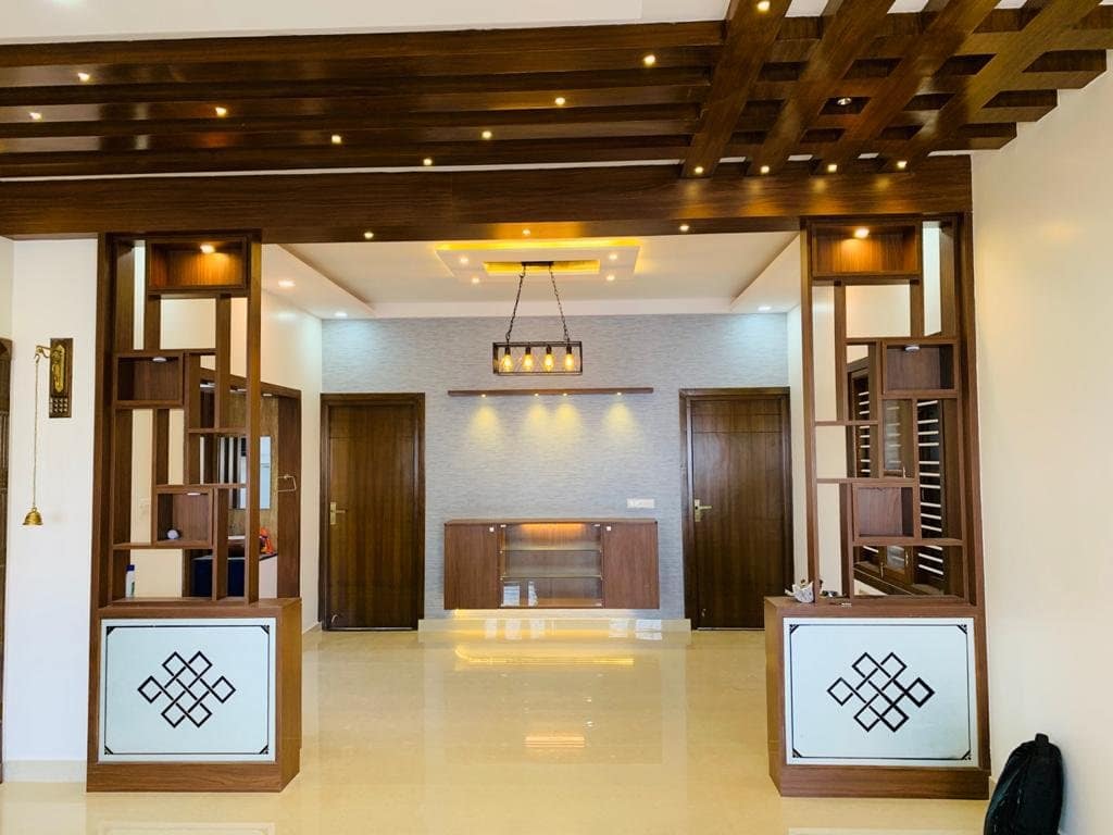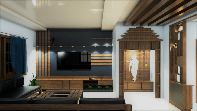 Quaint and refined living area is fusion of modern architecture infused with traditional theme-based design crafted keeping aesthetic and comfort of the users in mind a simple tv unit and Puja unit tailored in designer wooden panelling with traditional door brings warmth into the space.