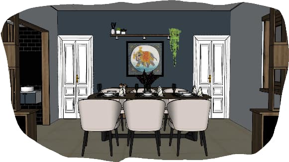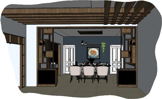After: Teak brown geometric arch separates dining from living, adding structure and elegance.