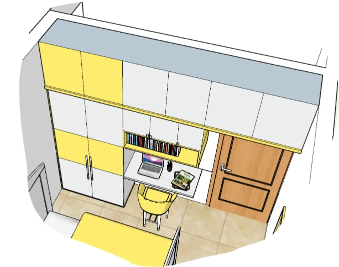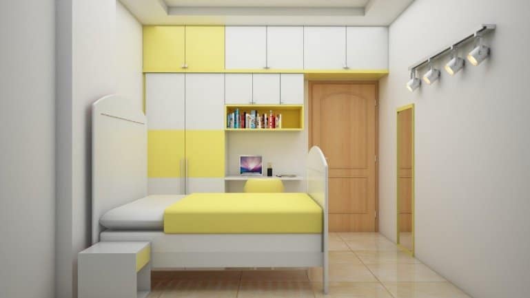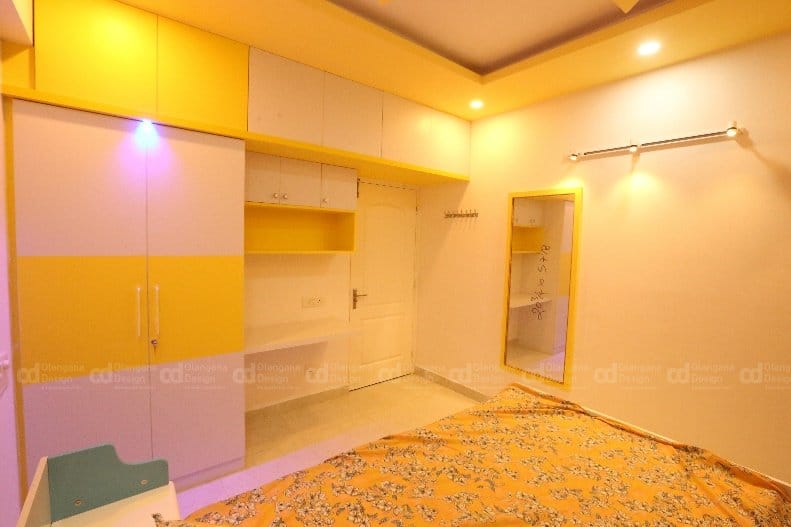 Small cozy Kid’s room customized in a fiery yellow and plain white color palette double door shutter wardrobe along with study unit, long mirror near the entrance and tailor-made designer cot goes perfectly with the theme meeting the client’s taste, gives visually striking appearance to the room.