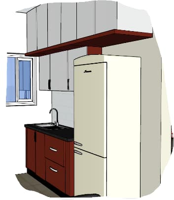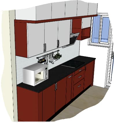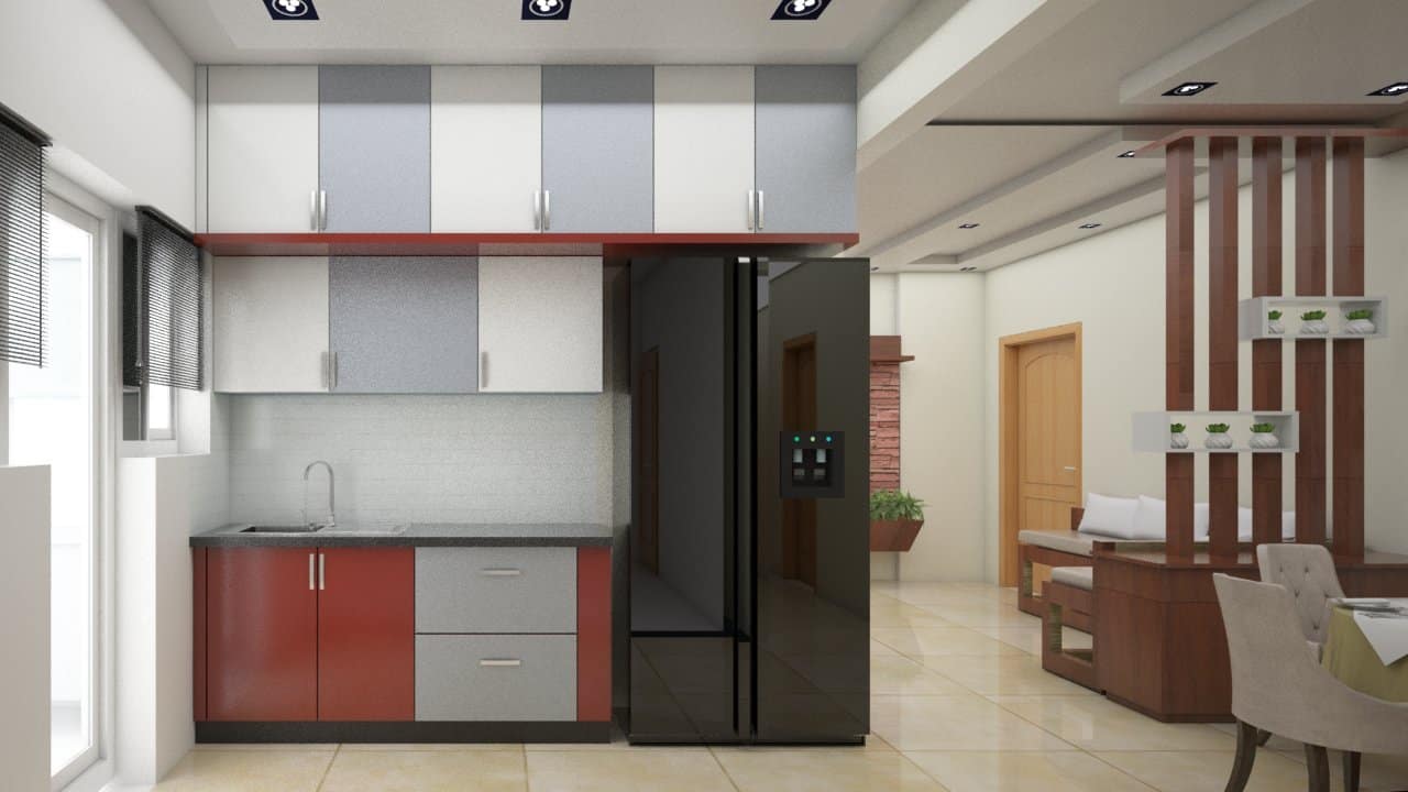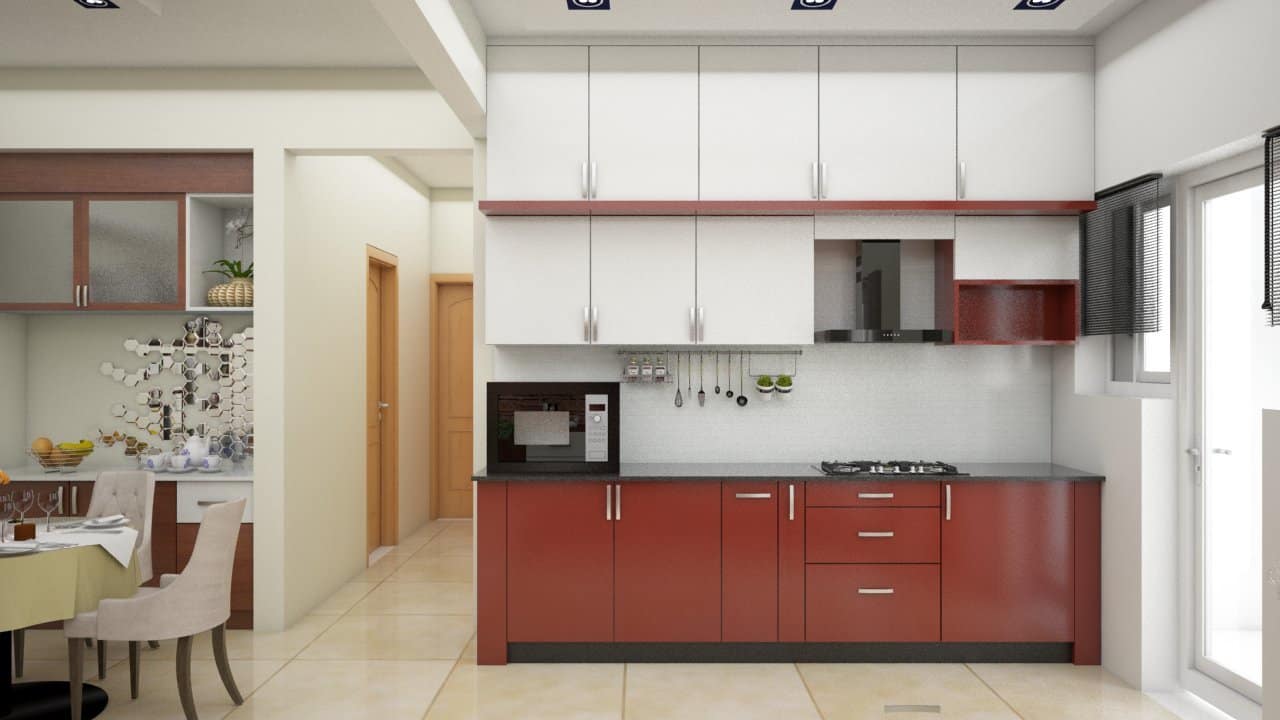 Simple, sober yet elegantkitchen design is fusion of bold burgundylaminatesforlower part and white laminates forupper partof kitchen cabinetsmatching the floorplan which was already given by the builder.