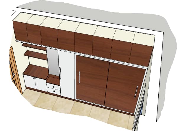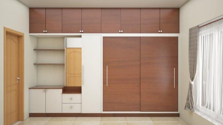 Hitting functional notes, we curated this master bedroom is equipped with tall storage, a dresser, sliding wardrobe and multipurpose storage subdivided into laundry storage in warm walnut brown color instantly draws anyone’s attention and designer statement back wallpaper was installed to balance the whole look.