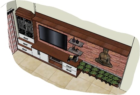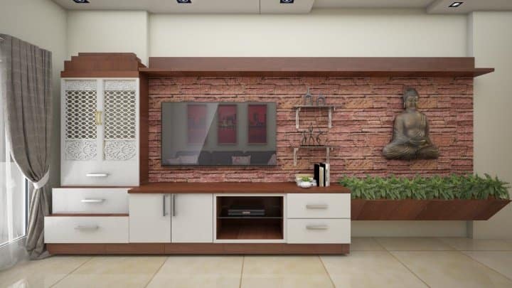 Traditional puja along with Tv unit in the living area aesthetically crafted with meticulous precision in warm brown and milky white palette by our designers adorned with Buddha statue and a planter box gives welcoming vibe to this living area partitioned from dining space by wooden rafters carved into rectangular open shelves with spotlights.