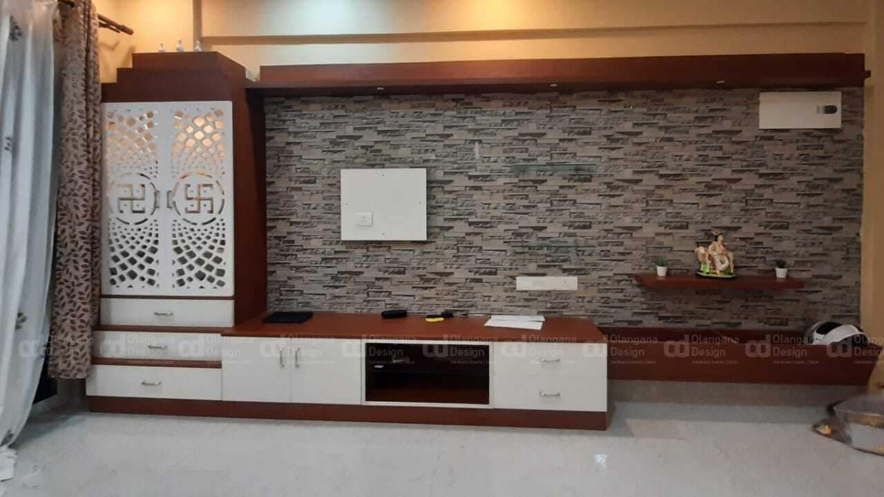 Modern interior design by Olangana Design in Bangalore, featuring a luxurious living room with TV unit and a sleek modular kitchen, showcasing complete home interior solutions.